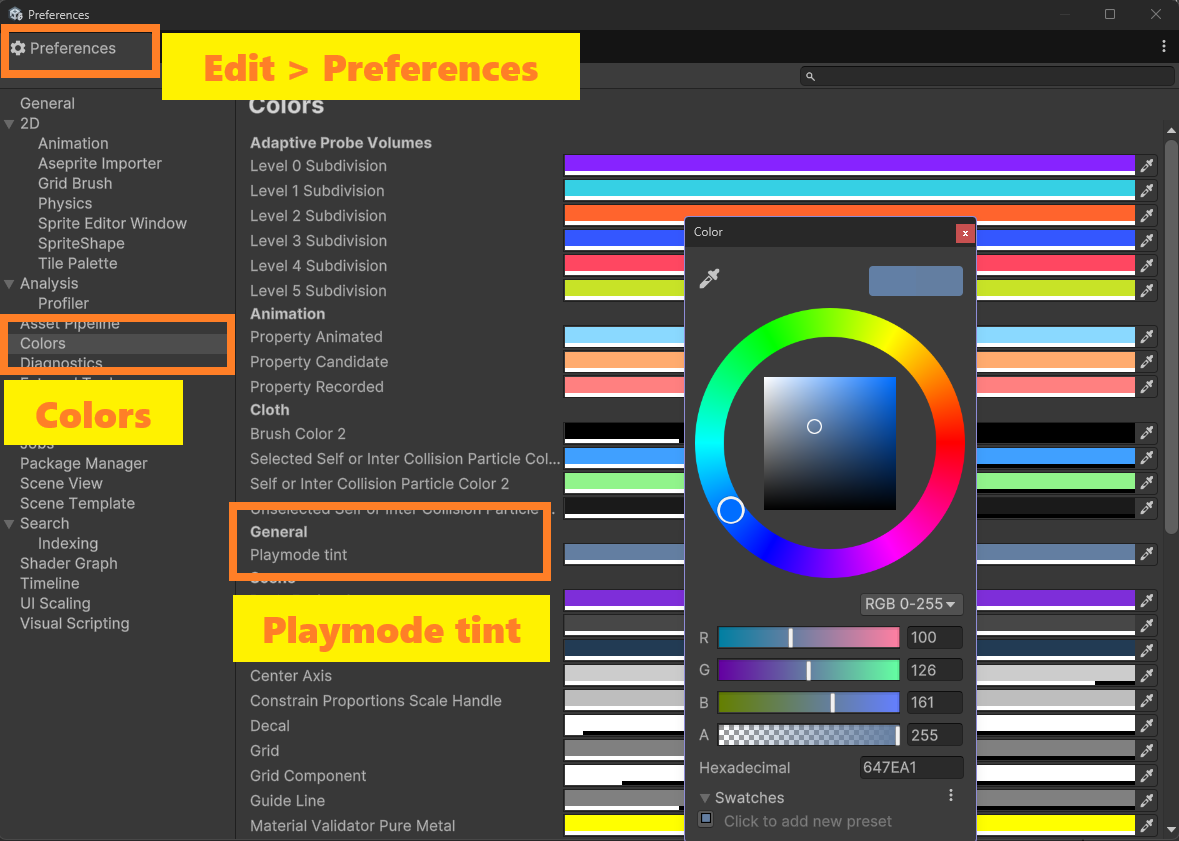 (3) 중간쯤에 있는 Playmode tint 항목을 찾습니다.
