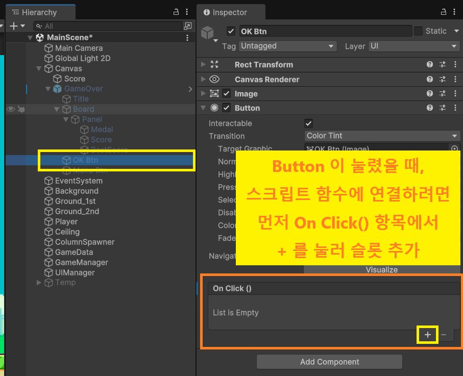 (2) Inspector 창 하단의 OnClick() 항목 확인