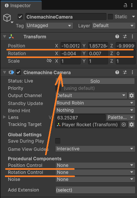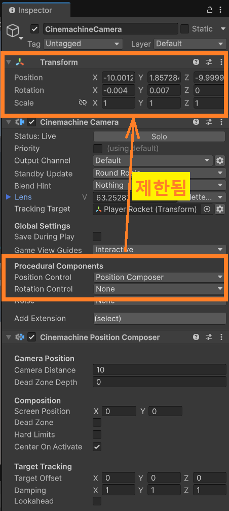 Cinemachine Camera 에는 위치와 회전을 담당하는 Procedural Components 가 있으며, 이를 통해 카메라의 위치와 회전을 계산하는 방식으로 제어합니다. 따라서 Procedural Components 의 Position Control 이나 Rotation Controal 항목을 선택하면 Cinemachine 카메라의 Transform 이 Main 카메라에서 겪었던 현상처럼 제어를 할 수가 없게 됩니다.