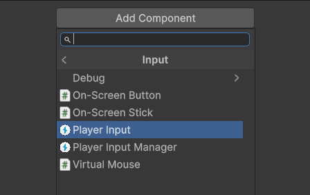 •   Add Component > Player Input 컴포넌트를 선택합니다.
