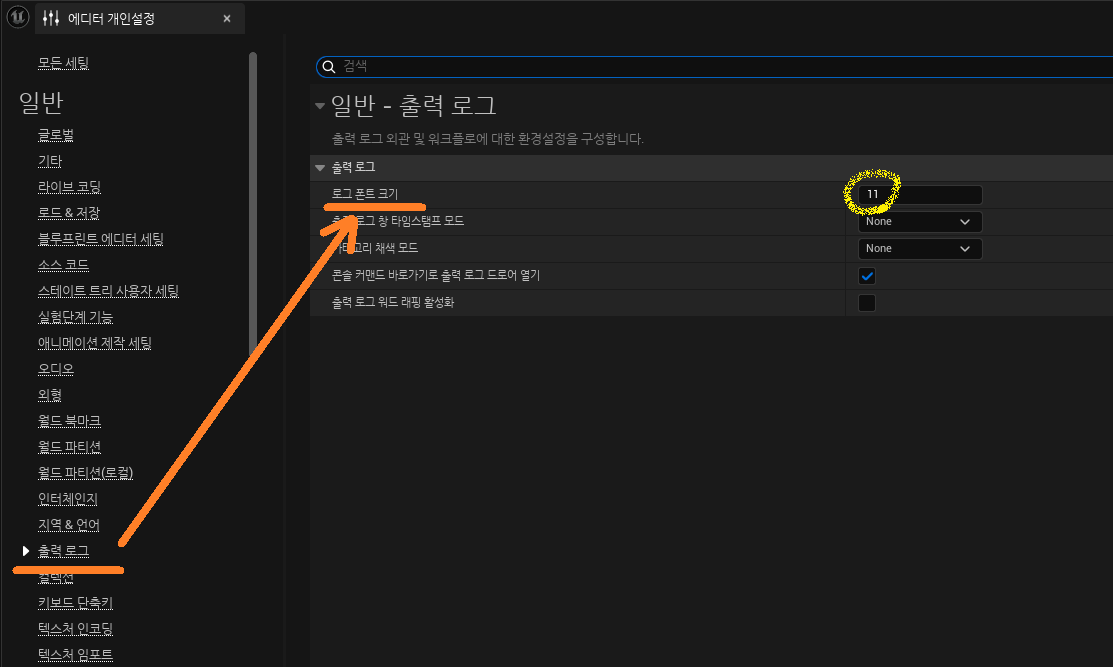 출력 로그창의 폰트 크기를 변경하고 싶을 때, "에디터 개인 설정" 에서 수정할 수 있습니다.