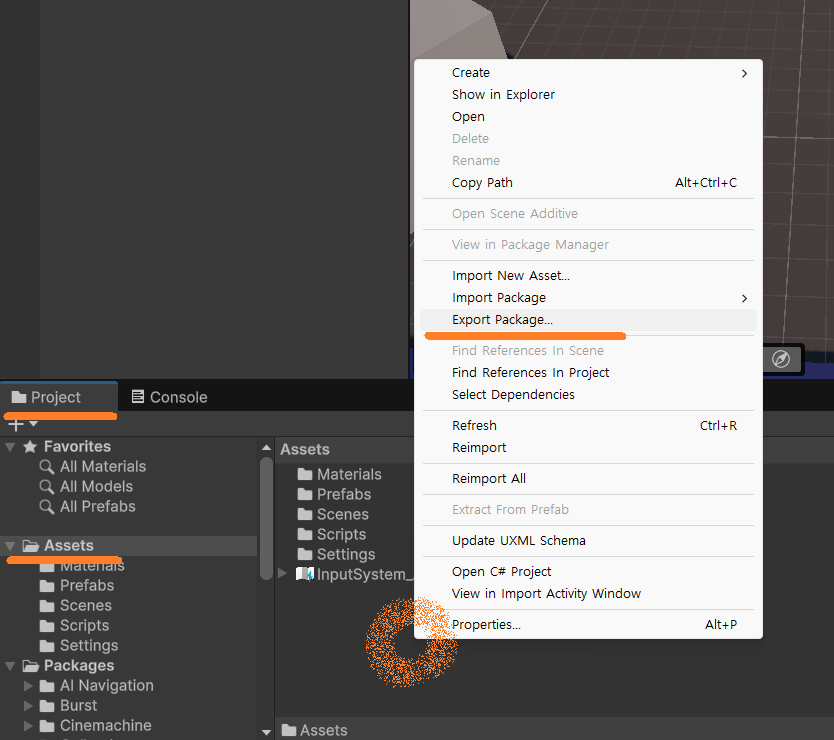•   프로젝트 창 빈공간에 마우스 우클릭 메뉴 > Export Package 를 선택합니다.