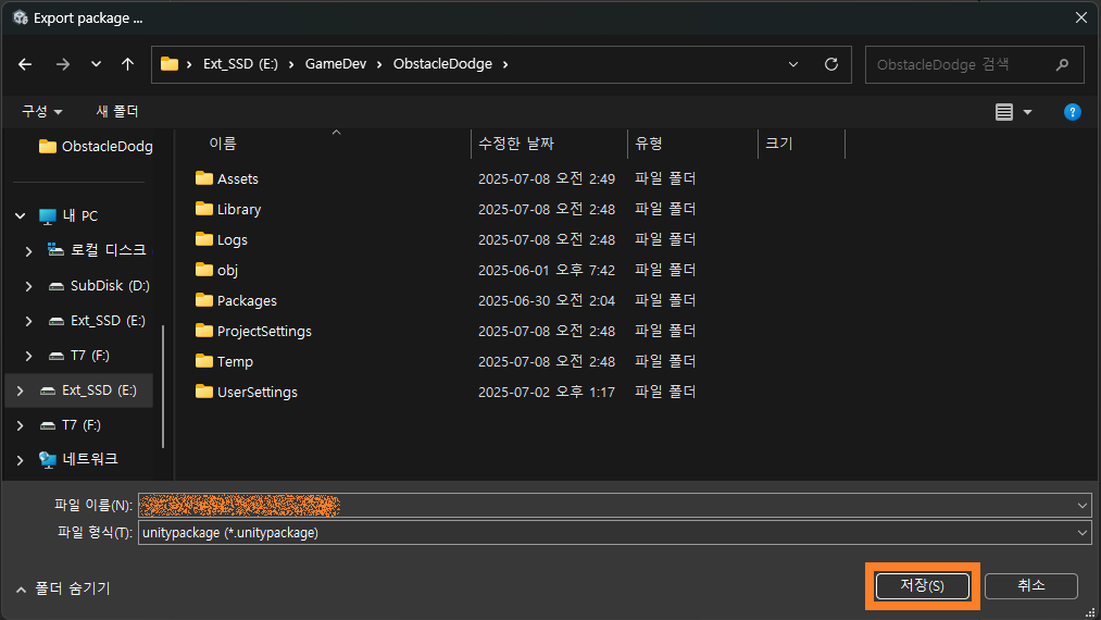 •   원하는 이름을 적고 .unitypackage 파일로 저장합니다.