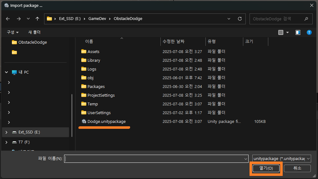 •   윈도우 탐색기가 열리면 .unitypackage 파일을 선택합니다.