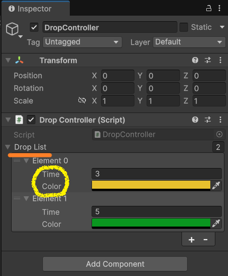 위 코드에서 [System.Serializable]이 없다면, dropList 자체는 인스펙터에 보일 수 있지만 내부에 들어 있는 DropInfo의 time, color 같은 속성은 보이지 않습니다.